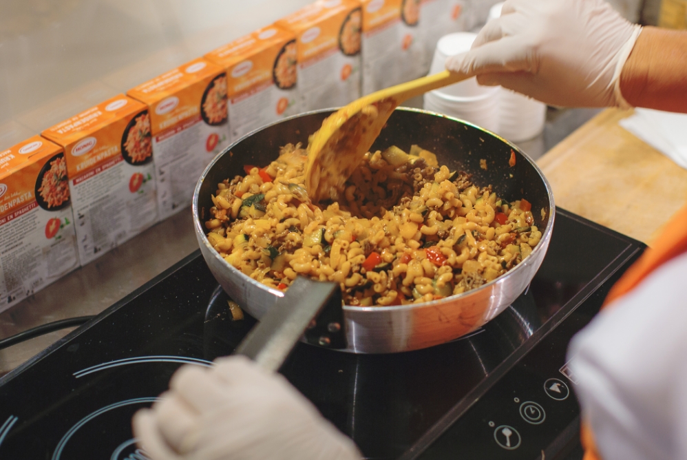 Om 11 uur start Marilyn’s werkdag. Daarom is ze altijd ruim van tevoren aanwezig, zodat ze de rolcontainer die Brandwise voor haar heeft klaargezet in het magazijn kan uitpakken en boodschappen kan doen in de winkel. “Een dag van tevoren krijg ik van Brandwise het recept toegestuurd. Dat print ik uit en dan ga ik boodschappen doen. Dat is heel goed geregeld. Ik reken de boodschappen aan het eind van de dag af, stuur een foto van het bonnetje en dan krijg ik dat weer snel terug. Heel fijn en netjes allemaal. En als ik alles heb verzameld begin ik met koken.”